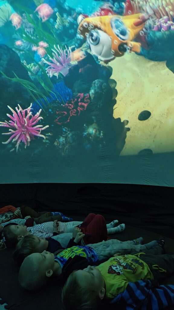 Dzieci miały okazję przenieść się do fascynującego świata bajek, oglądając je w wyjątkowej, kopułowej przestrzeni, która pozwoliła poczuć się jak w samym środku wydarzeń.